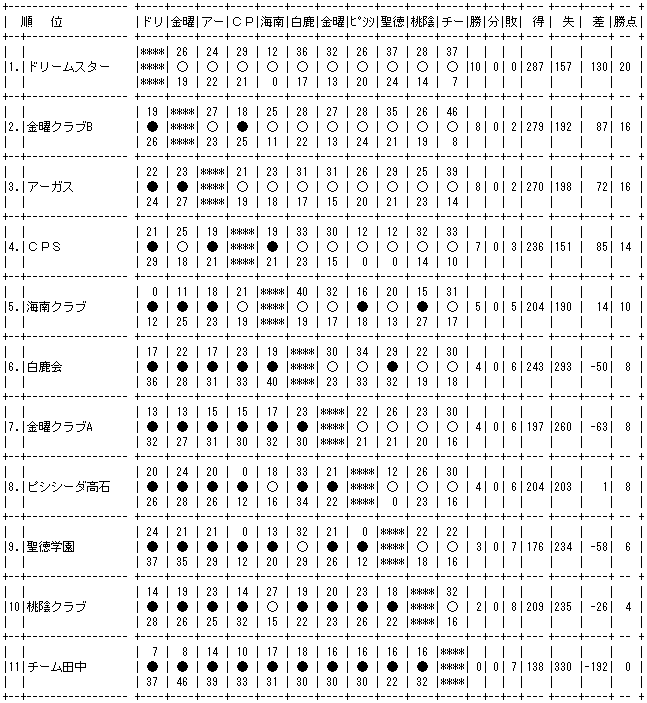 リーグ順位の決め方 1)勝点(勝ち=2,引分け=1,負け=0) 2)棄権の少ない方が上位 3)総得失点差 4)総得点 5)対戦者間の成績