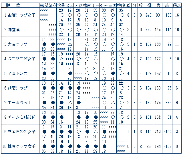 リーグ順位の決め方 1)勝点(勝ち=2,引分け=1,負け=0) 2)棄権の少ない方が上位 3)総得失点差 4)総得点 5)対戦者間の成績