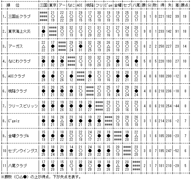 リーグ順位の決め方 1)勝点(勝ち=2,引分け=1,負け=0)