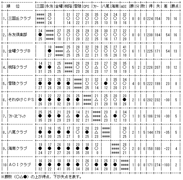 リーグ順位の決め方 1)勝点(勝ち=2,引分け=1,負け=0) 2)得失点差 3)総得点 4)対戦者間の成績